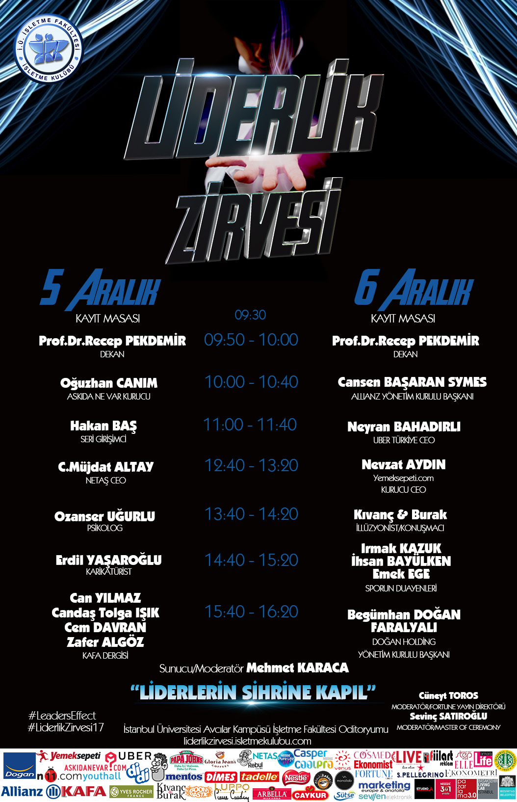 İstanbul Üniversitesi Avcılar Kampüsü İşletme Fakültesi Oditoryumu’nda Sevinç Satıroğlu ve Cüneyt Toros‘un moderatörlüğünde gerçekleşecek olan Liderlik Zirvesi’17 bu sene; Oğuzhan Canım, Hakan Baş, C. Müjdat Altay, Erdil Yaşaroğlu, Can Yılmaz, Candaş Tolga Işık, Cem Davran, Zafer Algöz, Cansen Başaran Symes, Neyran Bahadırlı , Nevzat Aydın, Kıvanç&Burak, Begümhan Doğan Faralyalı, Irmak Kazuk, İhsan Bayülken, Emek Ege, Ozanser Uğurlu gibi değerli isimleri ağırlıyor.