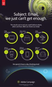 Tüm “e-posta öldü”— Çok kirli! Spam dolu! Dikkat dağıtıcı! Snapchat! — konuşmalarına rağmen e-posta hala dijital iletişimde vazgeçilmez bir standart olma özelliğini koruyor. Y kuşağı tüm yaş grupları içerisinde e-postalarına en çok bakan yaş grubu, hatta Adobe’un yeni çalışmasından çıkan verilere göre, neredeyse yarısı tuvalette dahi e-postalarına bakıyor. Bkz: blogs. Yine aynı çalışmaya göre, %98’i çalışırken her birkaç saatte bir, %87’si iş dışında da e-postalarını kontrol ediyor.