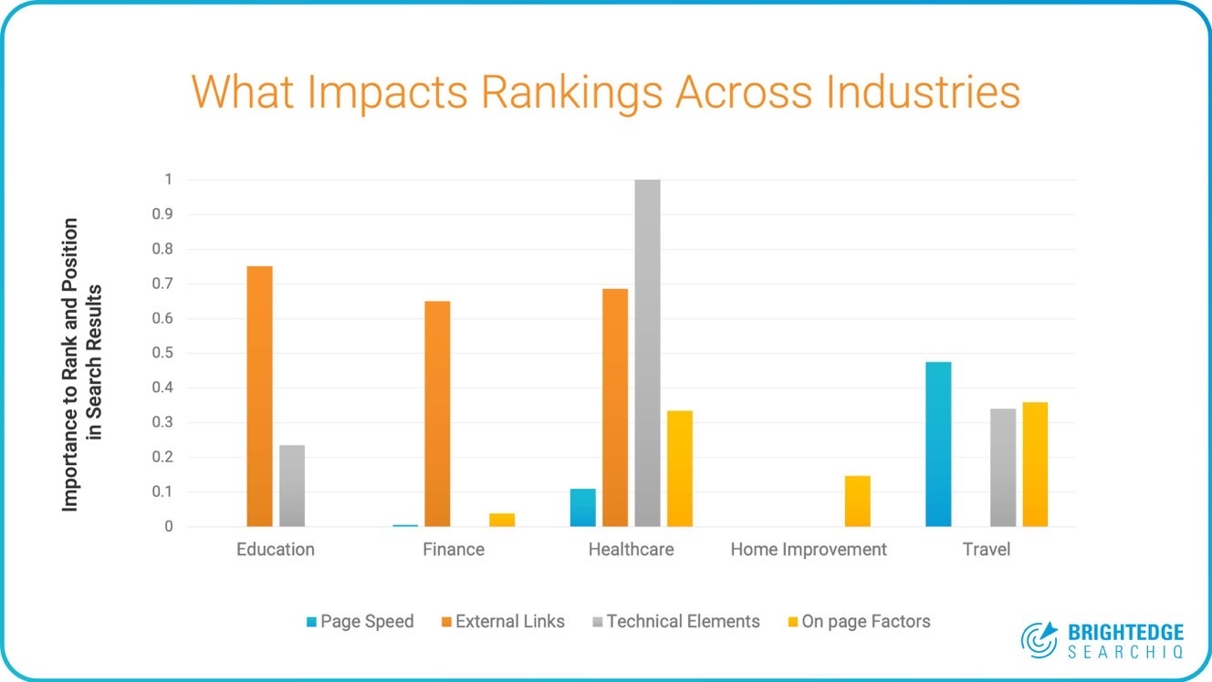Örneğin, blog trafiğinizin %85’inin içeriğinizi bir mobil cihaz üzerinden bulduğunu düşünüyorsanız, kaliteli bir mobil sayfa deneyimi sunmaya ciddi şekilde öncelik vermelisiniz. Sayfa hızı, harici bağlantılar, teknik öğeler ve sayfadaki faktörler gibi sıralamaya katkıda bulunan faktörlerin etkisi sektöre göre değişir: