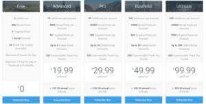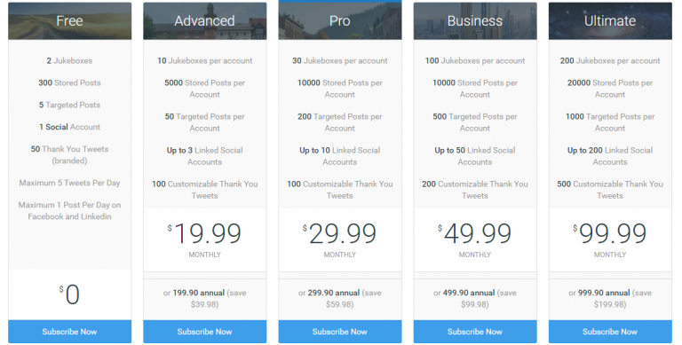Ücretsiz bir Jukebox planı seçerseniz bu size 5 adet kayıtlı mesaj ve 300 adet depolanmış Jukebox tarafından oluşturulmuş tweet sunar. Ücretsiz paket aynı zamanda Facebook üzerinden günde bir yayın ve Twitter üzerinden günde 5 tweet’i sizin adınıza atmak ile sınırlıdır.
