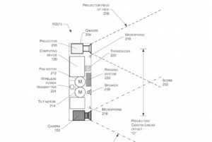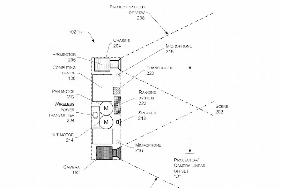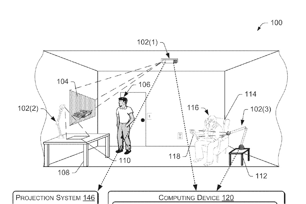 Patent gösteriyor ki projeksiyon sistemi odanın tavanına da monte edilebilecek. Patent, Amazon’un halihazırda ilk örneklerinin olduğunu söylememesine rağmen teknoloji çokta uzak görünmüyor.
