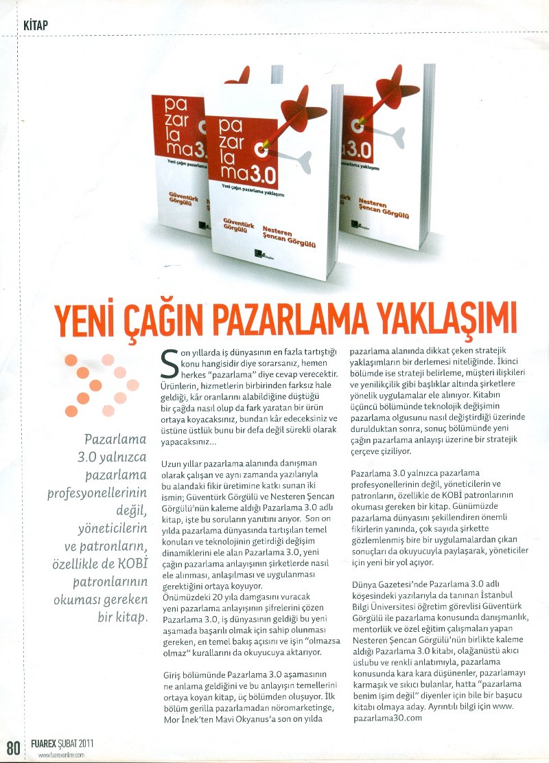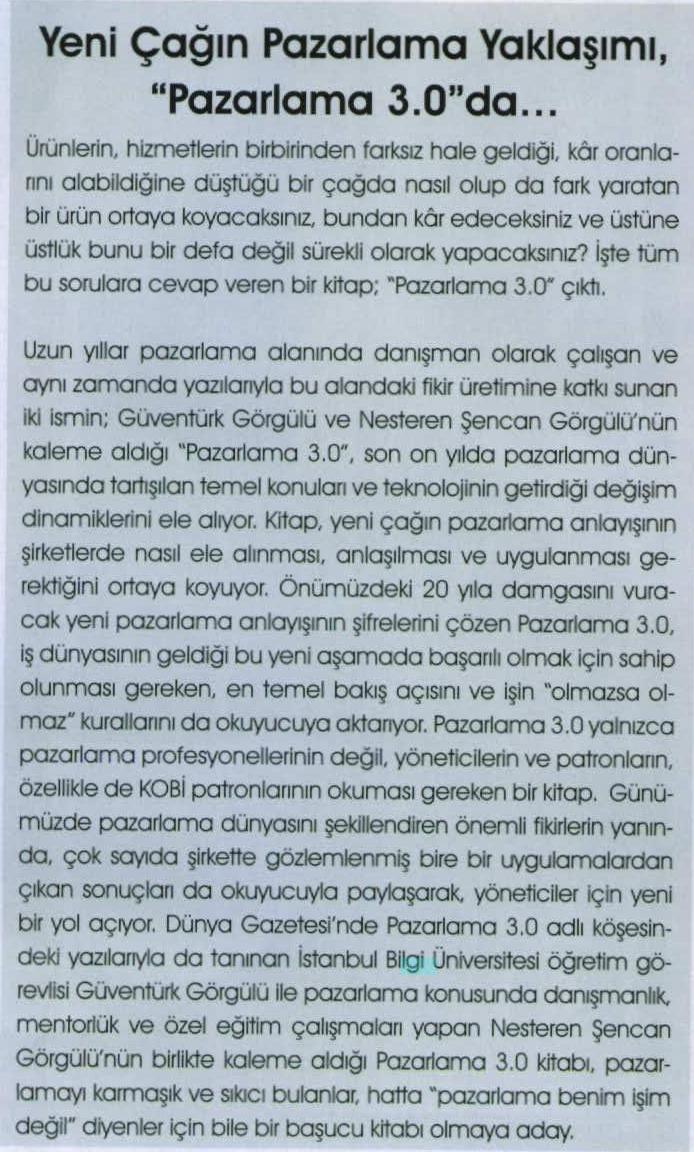 Elinizdeki ürün veya hizmetten yola çıkmak yerine, tam tersi bir yol izleyip insanların bugün ve gelecekte tam olarak ne istediği öngörme becerisinin ön plana çıktığı yeni pazarlama anlayışı kavramı ilgili “Pazarlama 3.0” isimli kitabın yazarlarından Güventürk Görgülü’nün reçetesi…
