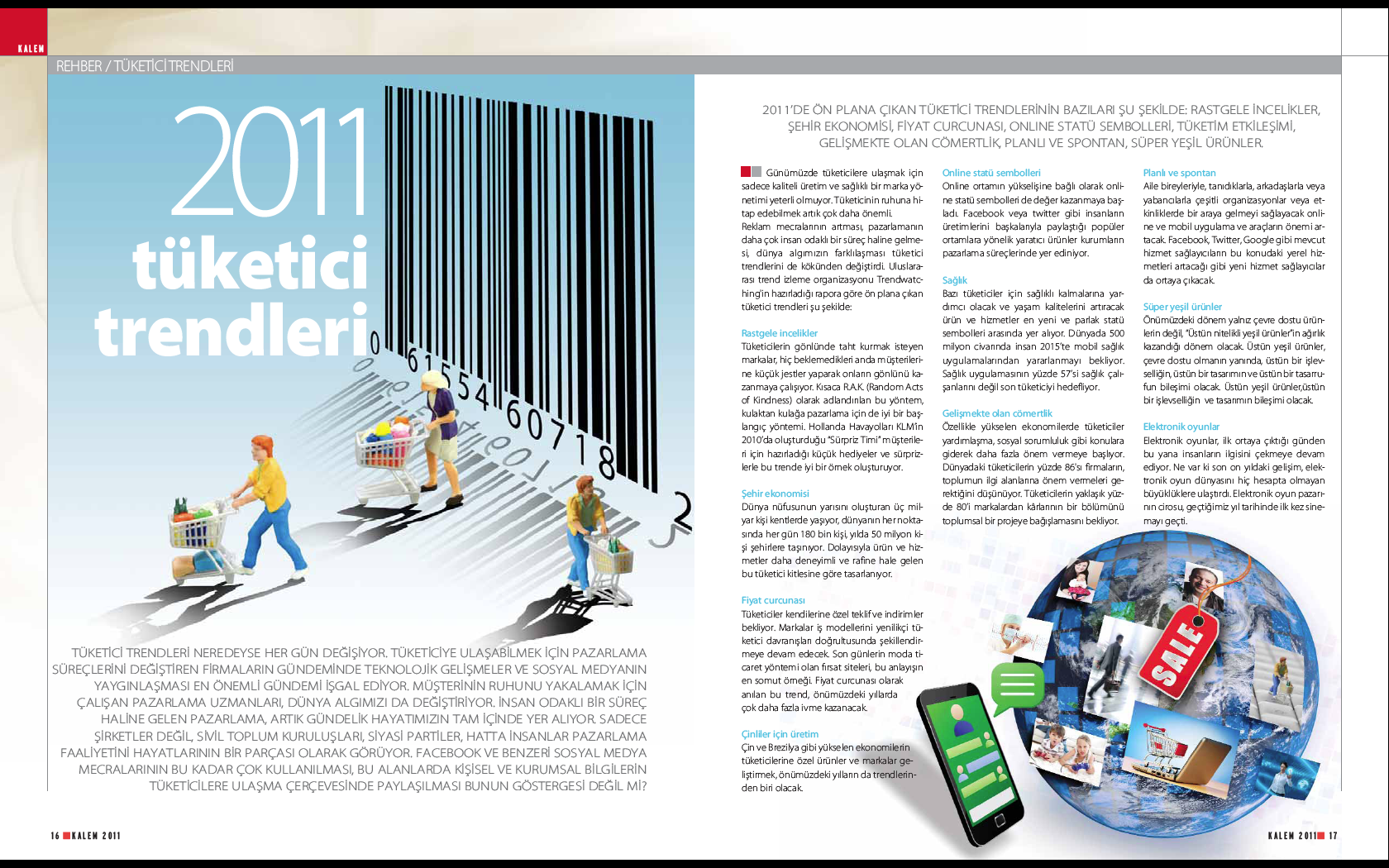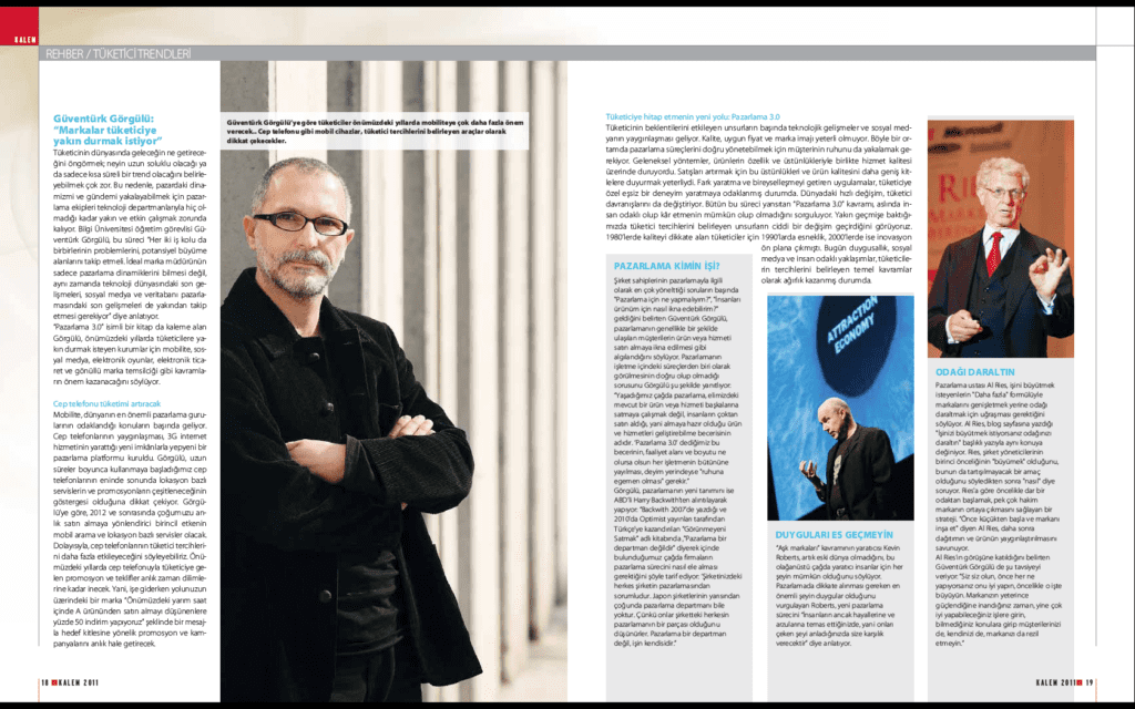 Türkiye’nin önde gelen kilit üreticisi Kale Grubu‘nun kurumsal dergisi Kale’m Aralık 2011 sayısında tüketici trendlerine yer verdi. Önümüzdeki yıllarda ekonomiye yön verecek tüketici trendlerinin ele alındığı yazıda Pazarlama 3.0’ın yazarı Güventürk Görgülü‘nün görüşlerine de geniş yer ayrıldı. (Okumak için resimlerin üzerine tıklayın)