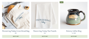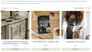 Örneğin, homestead blog yazarı önlük ve havlu gibi çeşitli yemek pişirme ve homestead ürünleri satıyor.