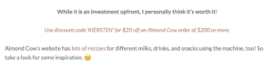 Bitki bazlı süt hakkındaki bu blog yazısı mükemmel bir örnektir çünkü izleyicilerinin indirim kodunu kullanarak indirim kazandığını rahatlıkla görebilirsiniz. Marka, Kiersten’in kitlesinden gelen siparişleri takip etmek için bu indirim kodunu kullanıyor ve ardından Kiersten bu siparişlerin birinden komisyon alıyor.