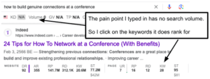 Blog gönderisinin sorunlu noktasıyla eşleşen bir anahtar kelime bulmanın basit bir yolu, Ahrefs Google Chrome uzantısını ve ardından Google’ı sorunlu noktayı etkinleştirmektir. Ardından, yazdığınız genel sorun noktası için en üst sıradaki gönderilere tıklayın ve bu blog gönderilerinin hangi uzun kuyruklu anahtar kelime varyasyonlarını sıraladığını görün.