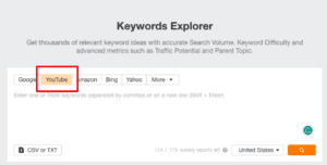 Trend olan YouTube anahtar kelimelerini belirlemek için Ahrefs gibi bir araç kullanabilir ve onu “YouTube” olarak ayarlayabilirsiniz.
