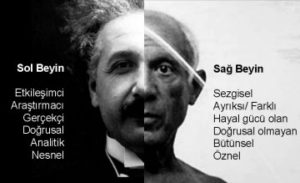 Şimdi gelelim şu sağ beyin sol beyin meselesine. Yine Peter Fisk’in sunumundan bu sefer görsel bir alıntı, sağ ve sol beynin fonksiyonlarını çok güzel anlatıyor; sol taraf Einstein, sağ taraf Picasso…