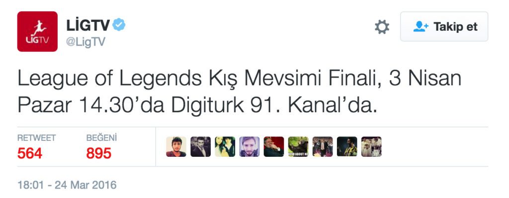 Lig TV’nin resmi Twitter hesabında duyurduğu haber ile eSpor severlerin yüzü güldü. Dünyada ve Türkiye’de çok büyük bir kitleye sahip olan League of Legends’ın bu sene, Türkiye ligi adına düzenlenen 2016 Kış Mevsim Finali Digitürk’ tarafından 3 Nisan günü naklen olarak yayınlanacak. Daha önce hiç bir zaman paralı bir kanalda yayınlanmayan ve internet ağları olan Twitch ile YouTube kanalları üzerinden yayını yapılan Kış Mevsim Finali, ilk defa bir kanalda yayınlanacak. Elektronik sporun önemi dünyada olduğu gibi Türkiye’de de azımsanmayacak bir kitleye hitap ediyor, binlerce insan bu müsabakaları ekranları başından canlı yayın ile izliyor.