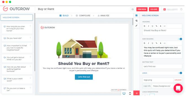 Outgrow’un tüm düzenleri yoğun bir şekilde test edilmiştir. Ayrıca; dönüştürme, etkileşim, ekran boyutları, tarayıcılar ve paylaşım için optimize edilmiştir. Akıllı oluşturucuları; tek seçim, çoklu seçim, sayısal kaydırıcılar, fikir ölçekleri, derecelendirmeler, dosya yükleme ve daha fazlasını sunar. Bu sayede oluşturabileceğiniz etkileşimli içerik şunları içerir: