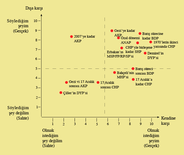 Ben yatay ve dikey ekseni 1’den 10’a kadar numaralandırarak son 25-30 yılda iktidar ve ana muhalefet konumuna gelen bazı partileri puanlayarak eksen üzerine yerleştirdiğimde bu sonuca ulaştım. Örneğin iktidar partisinin 2002-2007 arasında, olmak istediği şey olmadığını ama topluma söylediği şey olmaya çalıştığını düşünüyorum. 2007’den sonra ise daha muhafazakar bir çizgiye girerek olmak istediği noktaya doğru gittiğini söyleyebiliriz. Yani begensek de beğenmesek de “Gerçekten gerçek” olmaya daha yakın bir noktaya… Gezi direnişi ve 17 Aralık sürecinden sonra ise partinin olabilecek en kötü noktaya yani ne söylediği gibi, ne de olmak istediği gibi bir noktaya sahte/sahte alanına savrulduğunu görüyoruz.