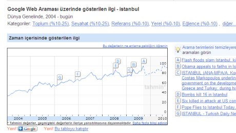 Bir başka denemeyi de turizmle ilgili yapalım. İstanbul, Londra (London), Paris, Roma ve New York aramalarını Google Arama Trendleri yardımıyla analiz edelim. Tüm dünyada yapılan aramalarda bu beş şehir içinde Londra birinci, Paris ve New York ikinci, Roma üçüncü İstanbul ise dördüncü sırada geliyor. Tabii burada her ülkenin kendi aramaları da hesaba katıldığı için internet erişiminin ve kullanılan dilin de önemi var. İstanbul, Türkiye dışında en çok Azerbaycan, Gürcistan ve Lübnan’dan aranıyor. Paris Gabon, Madagaskar ve Mali’den, Londra Gambiya, Nijerya ve İrlanda’dan, New York ise Haiti, İrlanda ve Kanada’dan aranıyor. Şimdi aranan kelimelere bakalım; yalnız burada Paris’le ilgili bir küçük yanıltmacaya dikkat etmek gerekiyor. İstanbul’da en fazla istanbul.net, İstanbul Üniversitesi ve Hotel İstanbul aranıyor. Paris’te ise, evet tahmin edebileceğiniz gibi en fazla aranan kelime Paris Hilton. Bunu göz ardı edersek ardından Paris Hotels, Paris France ve Disneyland Paris gibi aramalar karşımıza çıkıyor. Londra’da ise yağmur herkesi canından bezdirmiş olmalı en fazla aranan kelimeler weather ve london weather (Hava durumu).