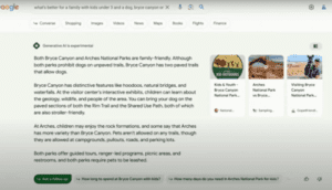 Google’ın I/O Konferansı’ndaki gösterisinde, birisi arama motoruna “soruyor”: “3 yaşından küçük çocukları ve bir köpeği olan bir aile için Bryce Canyon mu yoksa Arches National Park mı daha iyi?” Google Arama, her birinin artılarını ve eksilerini ayrıntılandıran uzun bir yanıt verir.