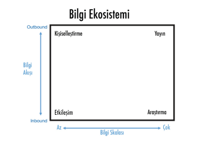 i” olarak adlandırdığımız panomuzu göstererek başlayacağız. Bilginin, outbound ya da inbound’dan kuruluşunuza akışı sağlanabilir, ve bilgi birkaç ya da daha fazla bileşene dokunur. Bu matrisin ortaya çıkan her köşesinin basit bir adı vardır: kişiselleştirme (bir kaç kişiye gönderilen bilgi), yayın (en kapsamlı terimle, sadece TV değil, birçok kişiyle iletişim kurarak), etkileşim ( birkaç kişiden bilgi alarak) ya da araştırma ( bir çok kişiden bilgi alarak).