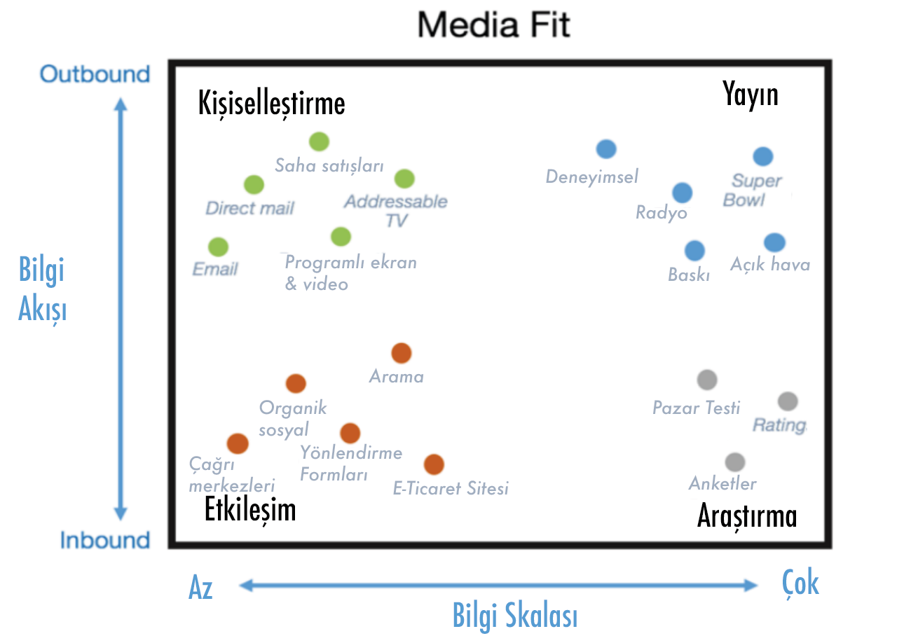 Eski usül pazarlamacılar, medya taktiklerini sezgisel olarak bu tahtaya göre eşler. En yaygın olarak yapılan hata ise her medya türünün belirli bir rolle veya burada bir köşe ile sınırlı olduğu algısıdır. Örneğin televizyon reklamcılığı birden çoğunluğa mesajlaşma ile o kadar bağlantılıdır ki, geniş anlamda “yayın” olarak adlandırılır. Bu eski “media fit” görüşü o kadar sınırlayıcı bir görüştür ki, sanki her iletişim biçimi tek bir işe sahipmiş gibi düşünülür. Ve bu görüş tamamen yanlıştır.