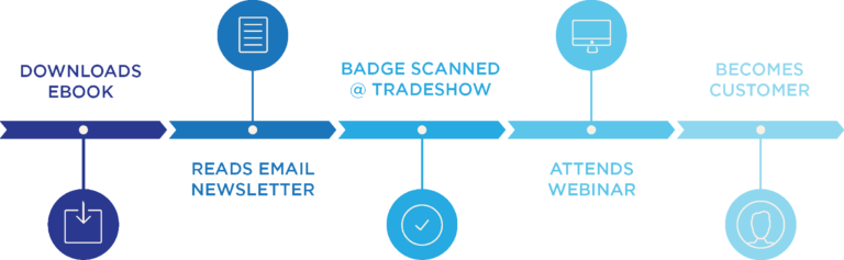 Bu çizim, bir kişinin müşteri olmadan önce bir e-kitap indirdiğini, bir e-mail bülteni okuduğunu, bir ticaret fuarında bir rozeti tarattırdığını ve bir web seminerine katıldığını gösteren çok noktalı bir ilişkilendirme modelini göstermekte. (Bu model hakkında daha fazla bilgiyi Pawan Deshpande’nin Pazarlama İlişkilendirme Modelleri: İçerik Pazarlamacıları İçin Bir Başlangıç adlı makalesinde bulabilirsiniz.)