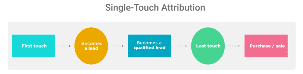 · Müşteriye dönüştürme: Potansiyel bir müşteri doğrudan bir içerik parçasından müşteriye dönüştüğünde, tek dokunuşla ilişkilendirmeyi kullanabilirsiniz. Tek dokunuşla ilişkilendirme, bir satış için kredinin %100’ünü tek bir pazarlama çabasına veren bir ilişkilendirme modelidir. Yukarıdaki grafikte, ilk dokunuştan müşteri adayı olmaya, ardından nitelikli müşteri adayı olmaya giden yolu gösteren bir illüstrasyon görebilirsiniz. Web sitenizde bir satış noktası sistemi varsa, içeriğinize her zaman doğrudan dönüşüm CTA’ları için UTM bağlantıları ekleyin.