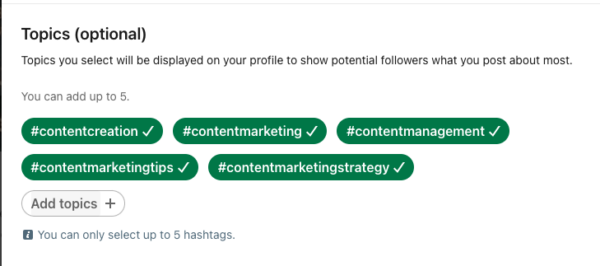 - En çok neyi paylaştığınızı belirtmek için en fazla 5 konu (hashtag) ekleyin.