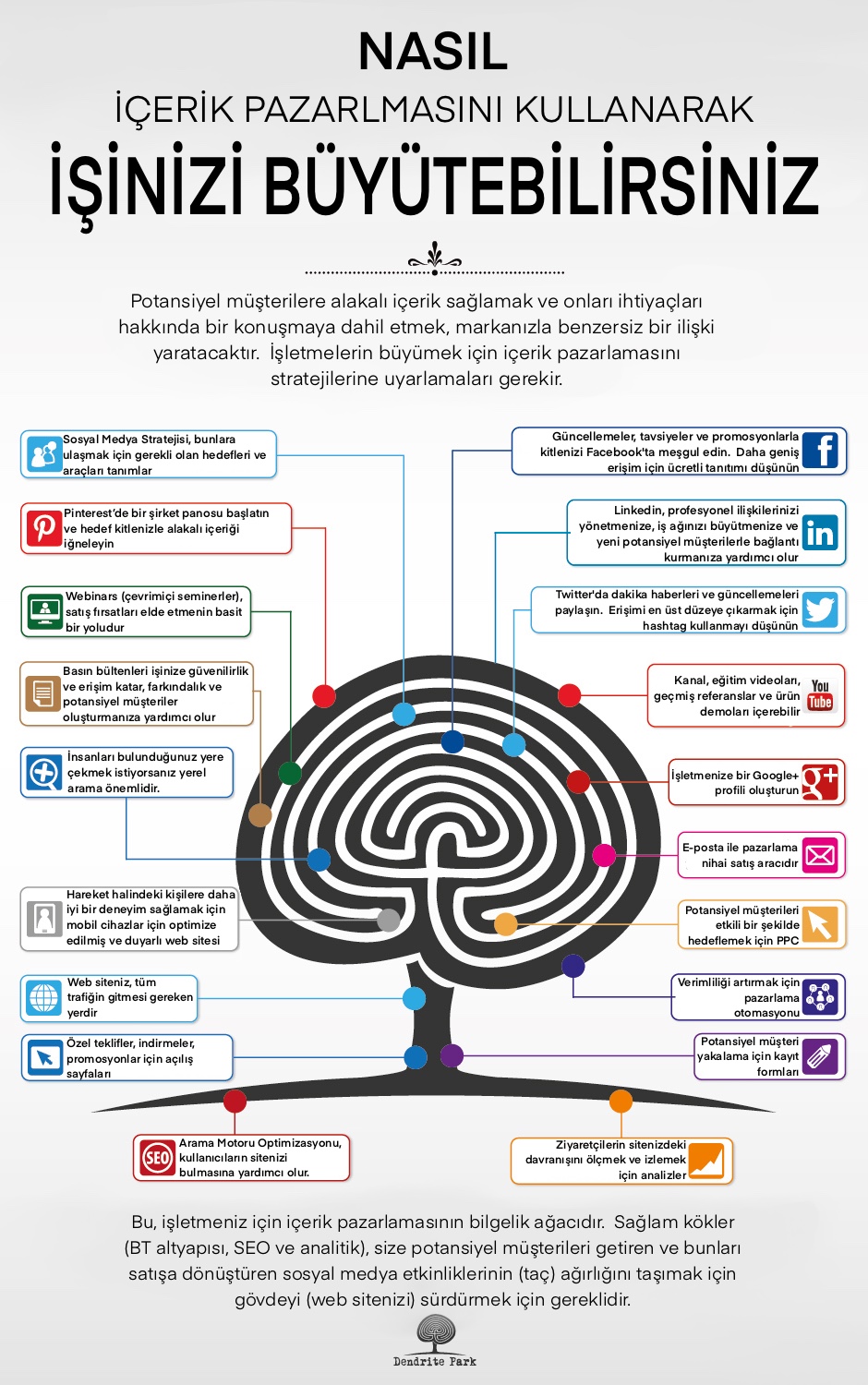 Dallar ağacın tacıdır. İçeriğinizi paylaşabileceğiniz çeşitli sosyal medya platformlarını temsil ederler.  Kendinizi Facebook,  Twitter veya LinkedIn gibi bariz olanlarla sınırlamamalısınız. Pinterest ve Google +’yı veya daha küçük olan düzinelercesini deneyin. Dallar birçok yönde büyüyebilir ve bu sosyal medya stratejinize göre hangilerine zamanınızı ve kaynaklarınızı harcayacağınıza bağlı olacak. Kendi kombinasyonunuzu bulun ve denemekten korkmayın.