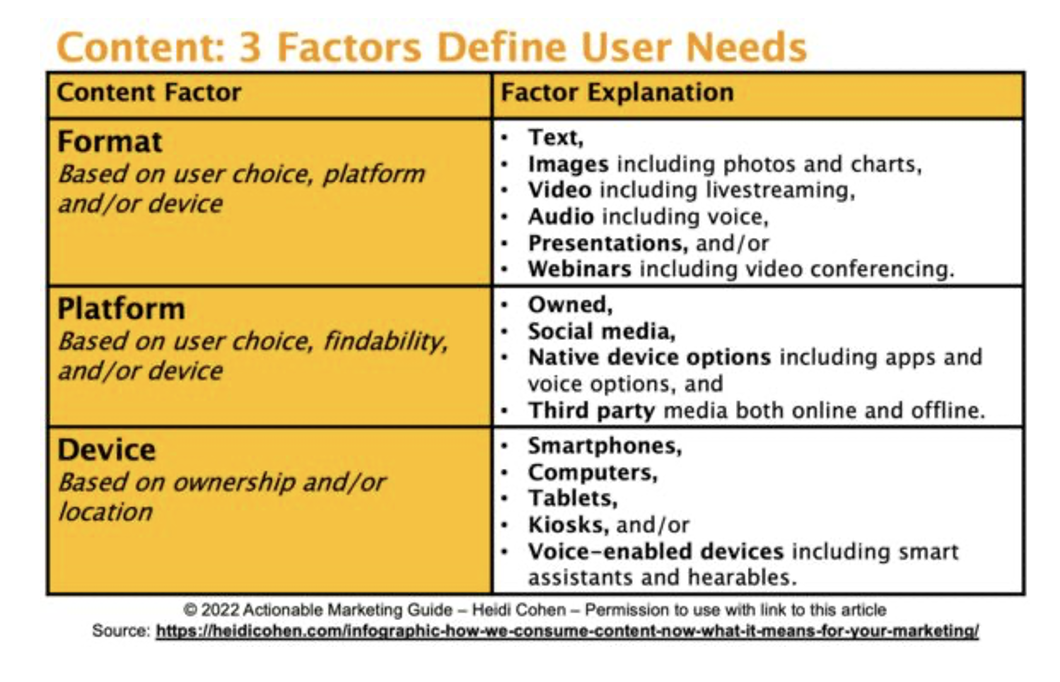 - İçerik pazarlamanızın, hedef segmentlerinizin her birinin tüketim ihtiyaçlarını karşıladığından emin olun. Belirli bir bağlamda cihaz, platform ve format tercihlerine göre içerik seçin.
