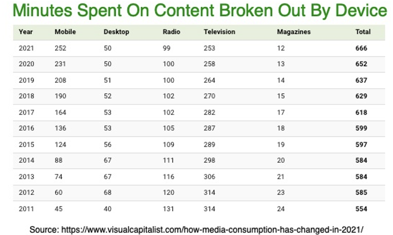 ABD’li yetişkinler arasında toplam medya tüketiminin günde yaklaşık 666 dakika veya 2021’de yaklaşık 11 saat olduğu tahmin ediliyor. (Kaynak: Visual Capitalist 2021)