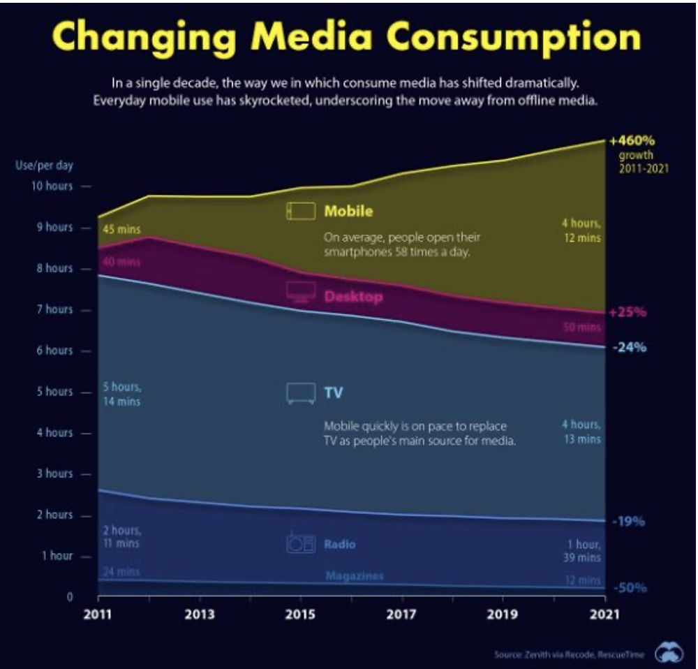 Akıllı telefonlar, son on yılda (2011-2021) içerik tüketimindeki artışı yönlendirmeye devam ediyor. Bu içerik tüketiminin tamamının pazarlama etkileri olmadığını belirtmek önemlidir.