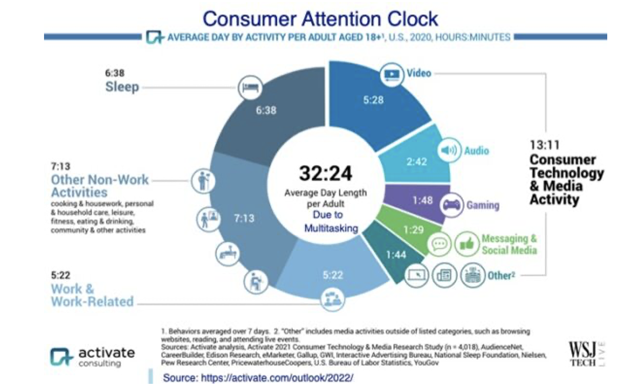 Ortalama olarak, 18 yaşından büyük ABD’li yetişkinler günde 13 saat 11 dakika medya ile vakit geçiriyor. Bu saat sayısı, teknolojinin yardımıyla çoklu görev nedeniyle 24 saati aşıyor. (Kaynak: Activate 2022)