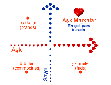Dördüncü grup ise eksenin sağ ve üst tarafında yer alan; hem saygı gösterilen hem de aşık olunan markalardır. İşte en çok para buradadır. Bunlar aşk markalarıdır.