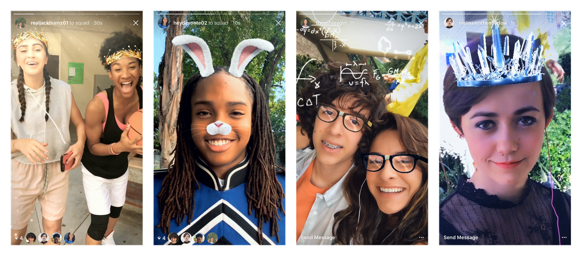 Instagram, yüz filtresi özelliği için başlangıç olarak sekiz filtreyle sunuyor ancak kısa süre içerisinde muhtemelen sayıyı daha da arttıracak. İlk sekiz filtreden bazılarının, uzun süredir Snapchat kullanan insanlara kullanıcılarına aşina geleceği düşünülüyor. Filtrelerden bazıları şu şekilde: tavşan kulakları ve diğer hayvan yüzleri, gözlükler (aynı zamanda matematik denklemleri havada dönüyor) ve kraliyet taçları.