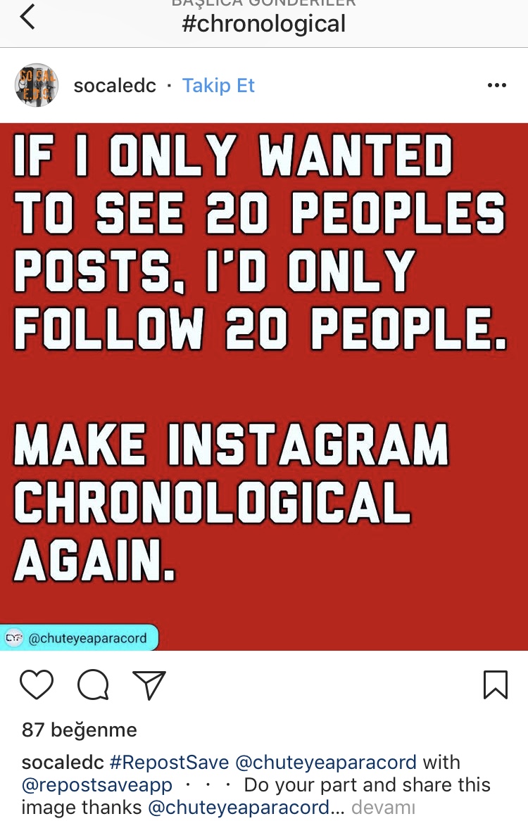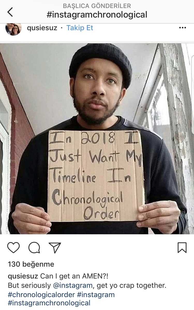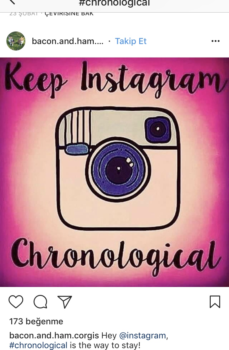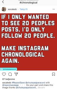 Eski algoritmanın geri gelmesini isteyen kullanıcılar, Instagram’da bu konuyla ilgili paylaşımlar yapmaya başladılar. Instagram’ın yaptığı açıklamanın üstünden 2 gün geçmesine rağmen bu konu hakkındaki paylaşımlar giderek artıyor. İki gün içerisinde #makeinstagramchronologicalagain etiketiyle 1126, #instagramchronological etiketiyle 227, #chronologicalorder etiketiyle 3623, #chronologicaltimeline etiketiyle 307, #chronological etiketiyle 4495, #chronologicalfeed etiketiyle 169, #bringbackchronological etiketiyle 1035 tane paylaşım yapılmış durumda.