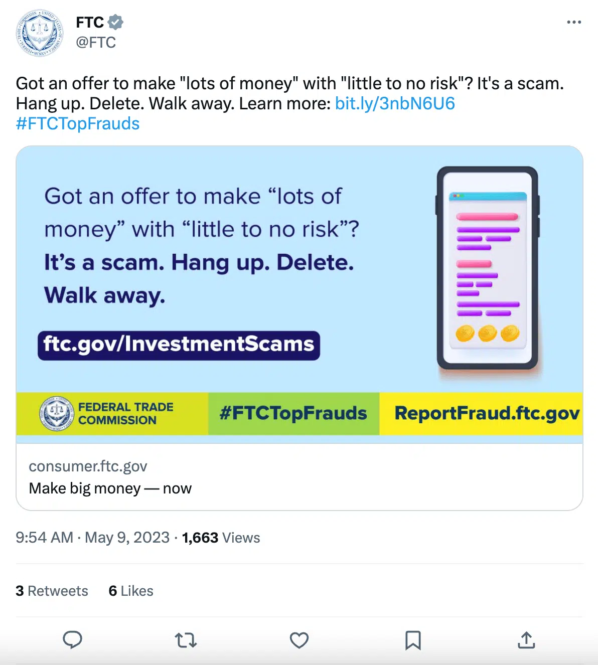 Kimlik hırsızlığına benzer şekilde, sosyal medyada da dolandırıcı reklamlar bulunmaktadır. Bu dolandırıcılıklarda hesaplar müşterileri kendilerine para veya bilgi vermeleri için kandırmak için sahte iddialarda bulunur. Shark Tank adlı TV programı kısa bir süre önce izleyicilerini asılsız iddialarda bulunan işletmelerin sosyal medya reklamları hakkında uyaran aşağıdaki kamu hizmeti duyurusunu (PSA) paylaştı.