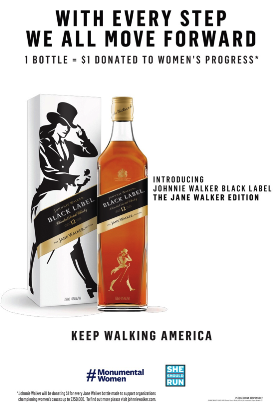 Johnnie Walker’ın sahibi olan Diageo firması, Jane Walker’dan elde edilen gelirin bir kısmını ve ayrıca 150.000 doları Monumental Women (New York’ta Central Park’a oy kullanma hakkı için mücadele veren Amerikan kadınlarını temsil eden bir anıt dikmek amacı taşıyan bir sivil toplum girişimi) kuruluşuna bağışlayacak. Ayrıca kadınların politikada daha etkin görev almaları için kurulmuş “She Should Run” isimli sivil toplum örgütü de Diageo’nun bağış yapacağı bir diğer kurum olarak öne çıkıyor. Her Jane Walker şişesinden elde edilen gelirin 1 dolarını kadın hakları örgütlerine bağışlayacağını açıkladı. Sadece 250 bin şişe üretileceğinden 250 bin dolarlık bir bağış olacağı belirtildi.