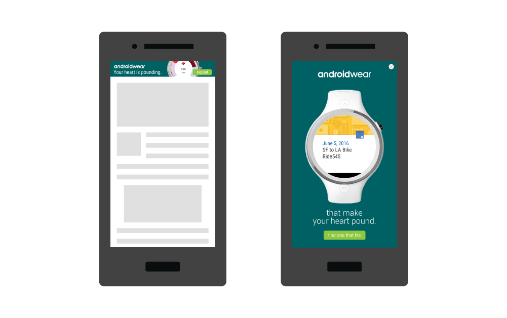 Bir Android Wear kampanyası, akıllı saat arayüzünü reklam ünitelerinde yeniden yarattı ve bu müşterilerin bu özelliklerle etkileşim kurmasını sağladı. Bu dinamik reklamlar, yer ve zaman gibi gerçek zaman veri sinyallerini dâhil etti, Android Wear’ın örnek bir deneyimini sundu. Bu bir mağazada değil, kullanıcıların mobil ekranlarında oldu.