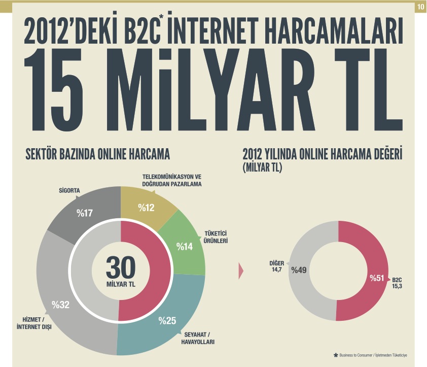 2012 yılında telekomünikasyon ve doğrudan pazarlama, tüketici ürünleri, seyahat ve havayolları online harcama değeri 15,3 milyar TL iken sigorta ve hizmet dışı online harcamalar 14,7 milyar TL olarak gerçekleşmiş bulunuyor.