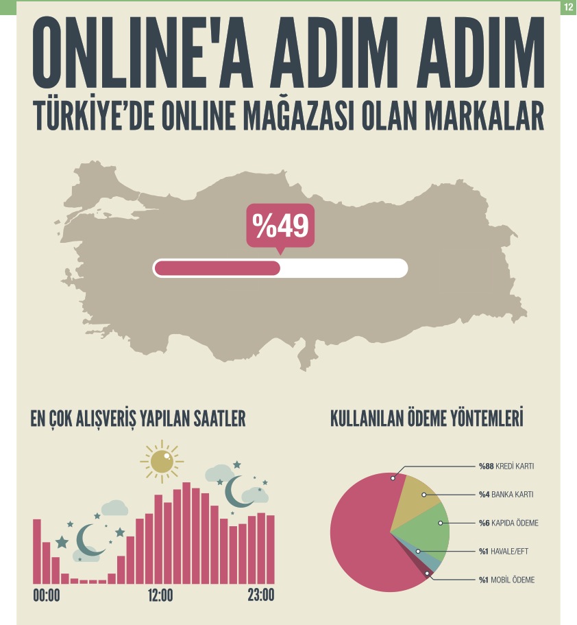 Türkiye’de online mağazası olan markaların oranının yüzde 49 olduğu görülüyor. En çok öğleden sonra saatlerinde online alışveriş yapmayı tercih eden tüketiciler, ödemelerini yüzde 88 oranında kredi kartıyla yapıyor.