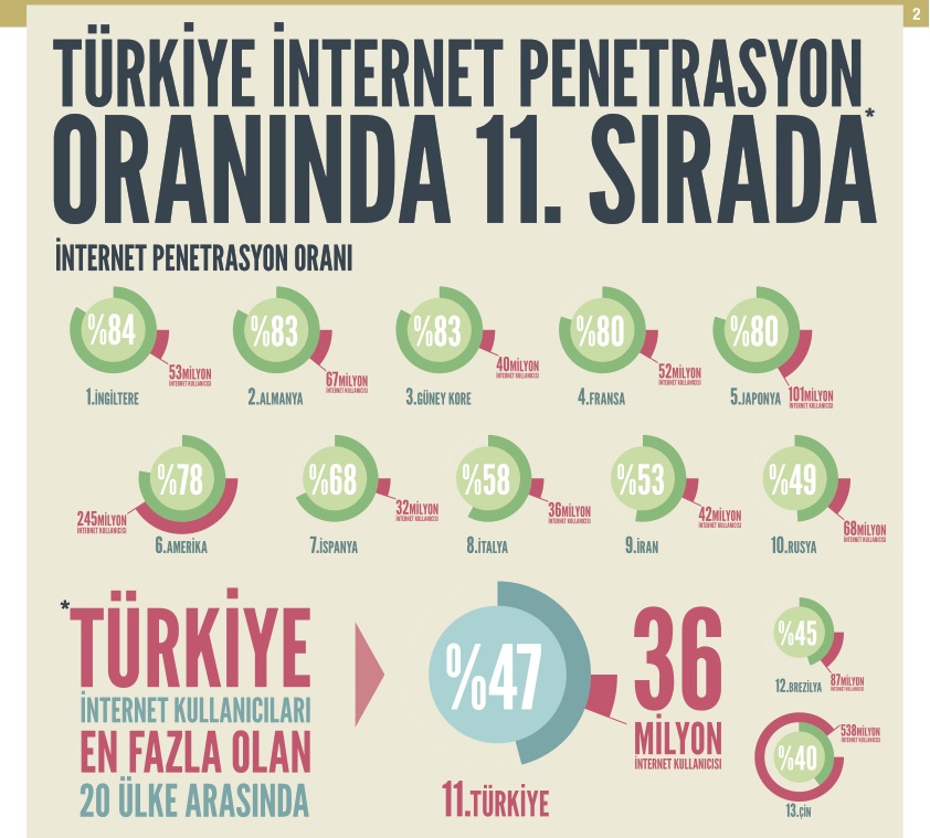 Türkiye internet kullanıcısı en fazla olan 20 ülke arasında yüzde 47 penetrasyon oranı ile 11. sırada yer alıyor. 1. ülke 53 milyon internet kullanıcısı ile yüzde 84 penetrasyona sahip İngiltere iken, 2. sırada 67 milyon internet kullanıcısı ile yüzde 83 penetrasyona sahip Almanya ve 3.sırada 40 milyon kullanıcı ile yüzde 83 penetrasyona sahip Güney Kore bulunuyor. Türkiye ise 36 milyon internet kullanıcısı ve yüzde 47 internet penetrasyonu oranıyla, dünya genelinde 11. sırada bulunuyor.
