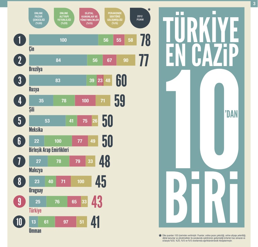 Online pazar çekiciliği, online altyapı yeterliliği, dijital kanunlar ve yönetmelikler ve perakende sektörü gelişmişliği kriterleri baz alınarak yapılan araştırmada, Türkiye en cazip ilk 10 pazar arasında gösteriliyor. Türkiye; 100 üzerinden online pazar çekiciliği kriterinde 25 puan, online alt yapı yeterliliği 76 puan, dijital kanunlar ve yönetmelikler kriterinde  65 puan, perakende sektörü gelişmişliği kriteri üzerinden 33 puan olarak, bu kriterlerin farklı oranlarda ağırlıklandırılması sonucunda, toplamda 100 üzerinden  43 puan alarak raporda 9. sırada yer alıyor.