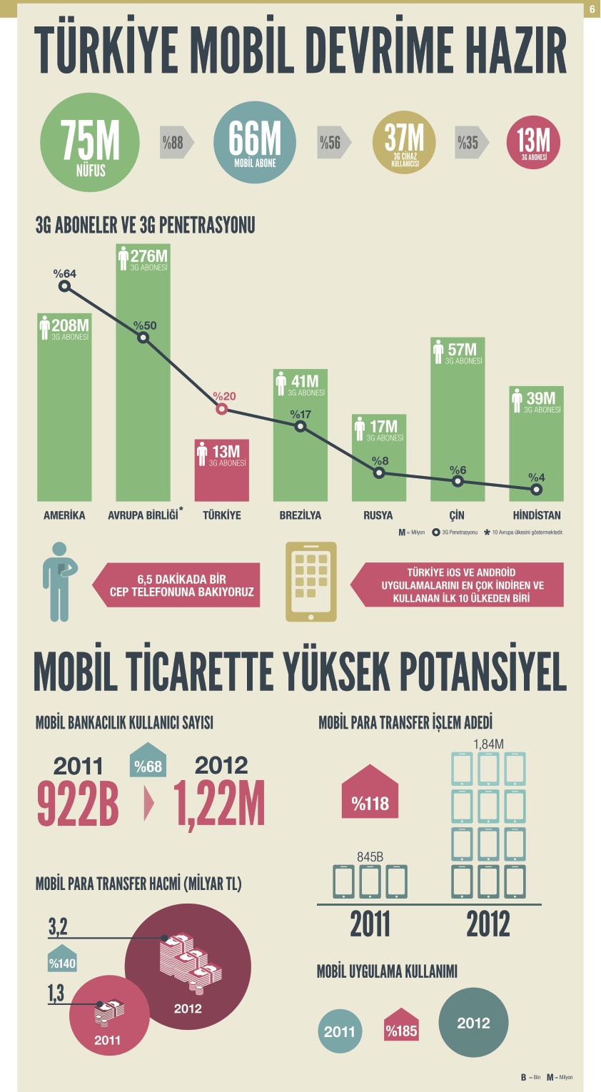 75 milyonluk Türkiye nüfusunun yüzde 88’i mobil aboneyken, 66 milyon mobil abonenin yüzde 56’sı 3G cihaz kullanıcısı. 37 milyonluk 3G cihaz kullanıcısının yüzde 35’i yani 13 milyonu 3G abonesi. Türkiye iOS ve Android uygulamalarını en çok indiren ve kullanan 10 ülkeden biri. Kullanıcıların 6,5 dakikada bir telefonuna bakması ise dikkat çekici veriler arasında yer alıyor.