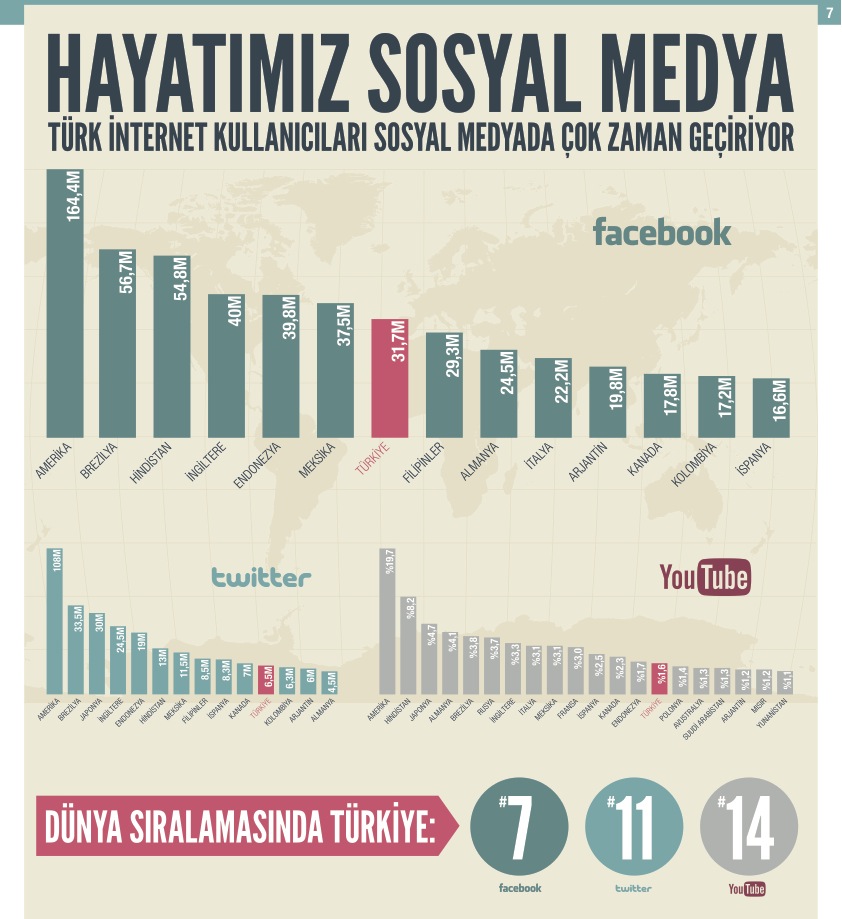 Türkiye 31,7 milyon Facebook kullanıcısı ile dünyada 7., 6,5 milyon Twitter kullanıcısı ile dünyada 11., yüzde 1,6 kullanım sayısı ile Youtube sıralamasında dünyada 14. Sırada yer alıyor.