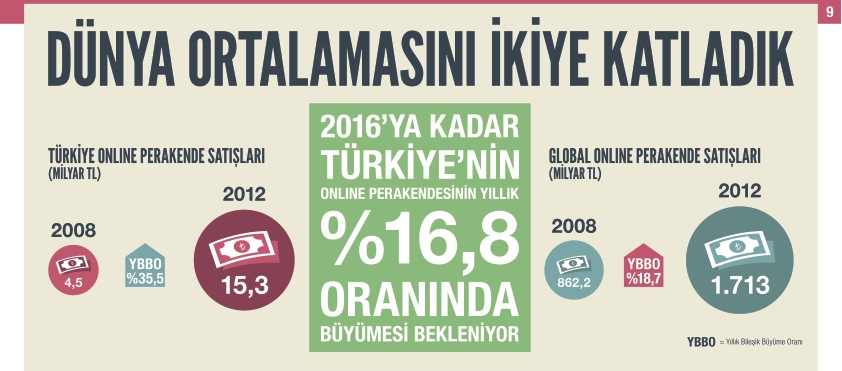 2008 yılında Türkiye online perakende satışları 4,5 milyar TL iken 2012 senesinde bu rakamın 15,3 milyar TL’ye ulaştığı görülüyor. 2016’ya kadar Türkiye’nin online perakendesinin yıllık yüzde 16,8 oranında büyümesi bekleniyor.