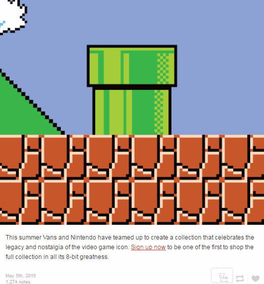 Örneğin, Nintendo Vans ile iş birliği yaptığını Tumblr üzerinden duyurdu ve aşağıdaki GIF ile duyuruyu harika bir şekilde özetlemiş oldu.