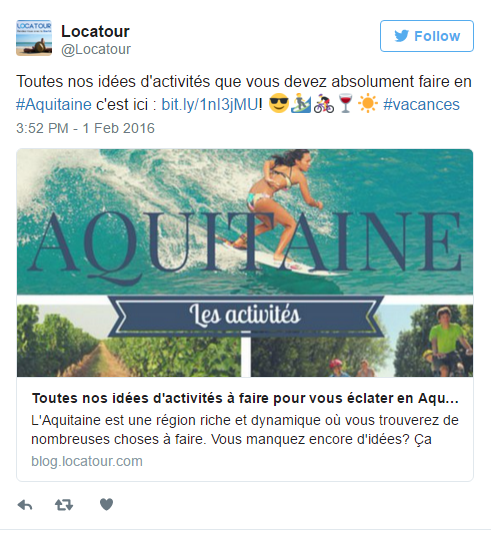 Yukarıdaki örnekte, turizm şirketi; Locatour, Fransa’nın Aquitaine bölgesinde yapılabileceklerle ilgili fikirlerini sunduğu blogun reklamını yapıyor. Attıkları tweette kullanılan emojiler, blogdaki tavsiyelerinin neler içerdiğiyle ilgili müşterilere fikir veriyor. Yine de söylemeden geçmeleyim, bu durum kullanıcılara gönderiye tıklamaları halinde neler görecekleriyle ilgili bir fikir verse de gönderiyi okumaları için yeterli bir sebep olamıyor.