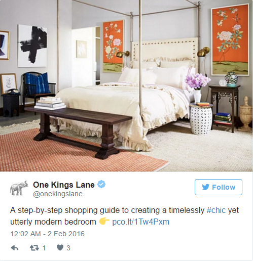Yukarıdaki örnekte, ev dekorasyon şirketi One King Lane, paylaştığı linke basit bir şekilde vurgu yapıyor. Şirket, linki parmağıyla işaret eden bir emoji paylaşmış. Bu, müşterilerin kafasında direkt bir düşünce oluşmasını sağlarken aynı zamanda onlara sırada ne yapmaları gerektiğini söylemenin eğlenceli bir yolu. Ancak, bir emojinin tweetinizde bir karakter harcadığını bilmenizde fayda var.