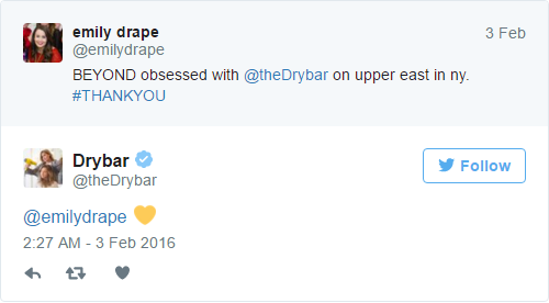 Yukarıdaki tweette, Drybar markası, Twitter’da Drybar hakkında bir haberi yayan müşterisine duyduğu minnettarlığı, ona sarı renk bir kalp göndererek iletiyor. Emojinin sarı renkte olması markanın diğer materyallerinde kullandığı sarı renkle de örtüşüyor. Diğer markaların da kendi kimliklerine uygun olarak seçebilecekleri farklı renklerde emojiler var.