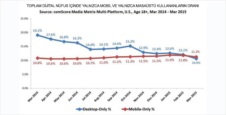 Daha geniş bir pencereden baktığımızda ise 2015 Mayıs ayında ComScore yaptığı araştırmanın sonucuna göre dijital dünyada ülkemizden daha fazla yer alan ABD’de, sadece mobil internet kullanımının tarihinde ilk kez sadece masaüstü kullanımının üzerine çıktığını açıkladı. Bu araştırmada ortaya çıkan sonuca göre ise sadece bir yıl önce yani 2014 Mart ayında, sadece masaüstünden internet kullananların oranı %19.1 ve sadece mobil cihazlardan internete girenlerin oranı %10.8’di. Ancak bir yıl sonra (2015 Mart) interneti sadece mobilden kullananların oranı son bir yılda %11.3’e yükselirken; sadece masaüstü internet kullananların oranı ise %10.6’ya düştü.