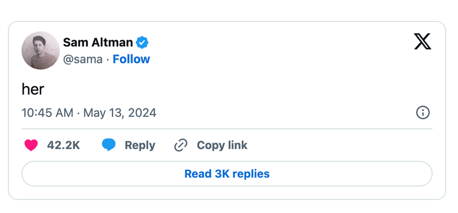İşte güncel bir örnek: Şirket geçen hafta GPT-4o’lu yeni ses modellerini piyasaya sürdüğünde, birçok kişi Sky adlı sesin 2013 yapımı Her filminde yapay zeka asistanını seslendiren Scarlett Johansson’a ne kadar benzediğini fark etti. Lansman etkinliğinden önce OpenAI CEO’su Sam Altman, X hakkında yalnızca “her” yazan tek kelimelik bir gönderi yayınladı.