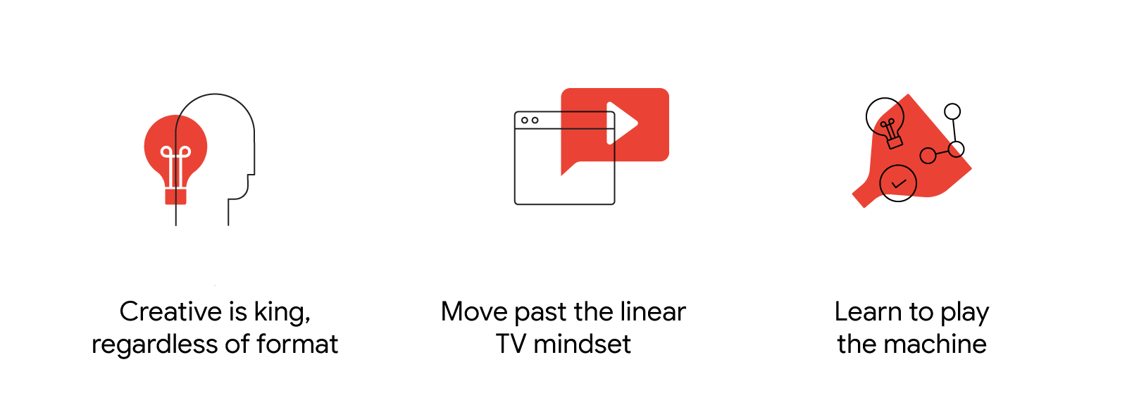 Bunu iyi yapmak, yaratıcı teknikleri geliştirmek anlamına gelir. Çoğu marka, YouTube’un ABCD’leri konusunda bilgili, ancak daha fazlasını yapabilirler. Nielsen, genel ABCD’lere uymakla ilişkili satış artışında %30’luk bir artış belirledi, ancak varlıkların %30’dan azı bu ilkelerle uyumlu. Bunu medya harcamanızla çarpın, bu çok fazla kullanılabilir değer.