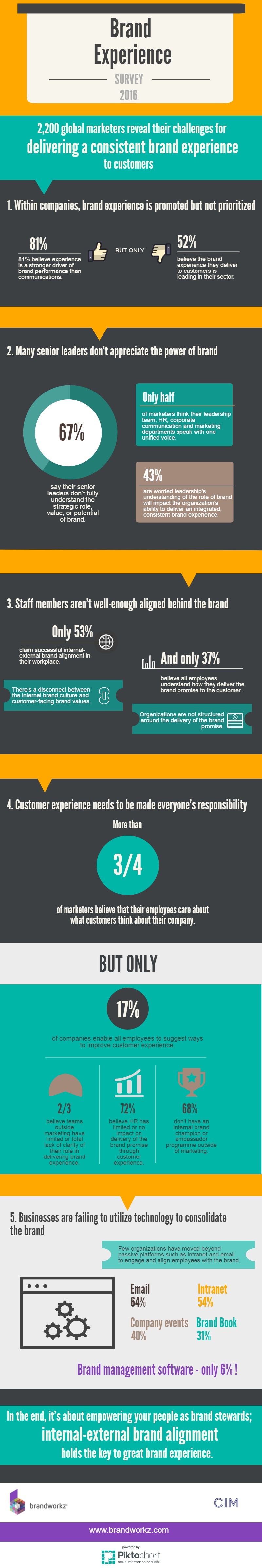 Brandworkz ve CIM tarafından marka deneyimi üzerine bir anket yapıldı ve sonuçları infografik olarak paylaşıldı. Bu infografiğe göre, dünya genelinde pazarlamacıların marka sıralaması konusunda ne hissettikleri, neden çalışanlarının marka ile uyuşmasının çok önemli olduğu, organizasyonların nerede daha çok gelişebileceği ve daha fazlasını kapsıyor.
