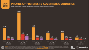 Reklamlama kitlelerine bakarsak cinsiyet dağılımı biraz değişiyor. Ocak 2021’den itibaren Pinterest’in kişisel reklamlama araçları kadın kitlenin %77.1 oranında ve erkek kitlenin %14.5 oranında olduğunu ve kalanının belirtilmemiş olduğunu ortaya çıkardı.