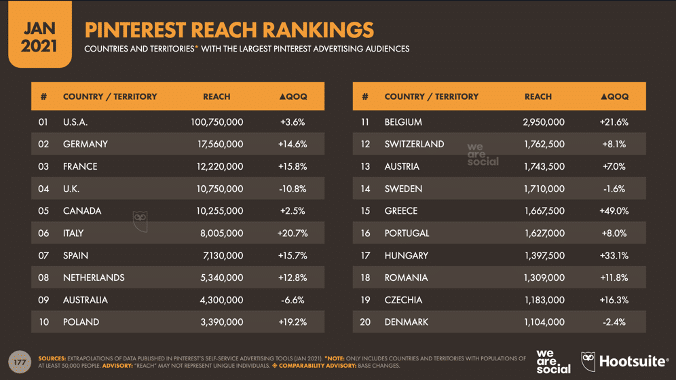 Ocak 2021’den itibaren Pinterest global aktif kullanıcı sıralamasında dünyanın en büyük 14. Sosyal ağ platformu.